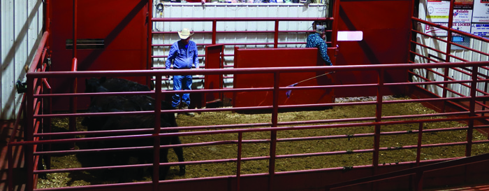 A red metal door on the left side of the ring breezes open, and cattle enter the ring. The scale beneath their feet takes the group’s weight and displays it on a screen to the left of the auctioneer’s booth. That same screen shares other relevant information, such as the number of head in the lot and the average weight of a single animal in the group.