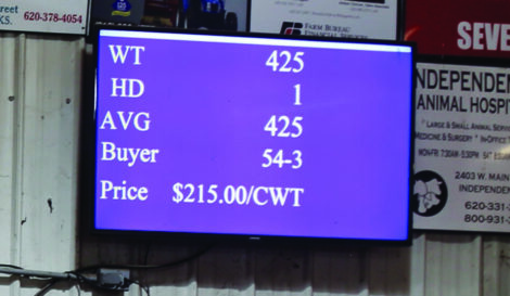 To the right of the booth, a second screen displays information about the previous bunch that just sold: the group weight, number of head, and average weight for a single animal; the bidder number of the buyer who purchased them; and the price they sold for.