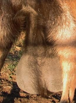 This is an udder just after it was milked. The doe is Aruba, my favorite and the granddam to Hawaii above. This is with her winter coat but where the hair swirls on either side is where her attachment is. A GREAT hind attachment.