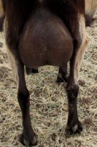 The best way to tell how an udder will develop is to look at your doe’s mom and her sire’s mom. If you don’t own them, the breeder of your doe most likely has photos or will let you see their udders. This is best when they are “in milk”, meaning they are producing milk. You’ll want to look at both the front and hind attachments. From the back, you want to be able to see how far down the leg the udder is attached, the further down, the better. Some doe’s don’t have any attachment at all. This one, stay away from if you are new to breeding dairy goats. I have had one in my herd but with good reason as I’ll explain when we get to her photo. The front of her udder you want to be a few inches behind her belly, where the umbilical was attached. It’s common for doe’s that are first fresheners to have a sort of cup at the front of their udders. This usually goes away with each delivery but I have seen a few doe’s that never loose it. It has nothing to do with the amount of milk this doe will produce. There was one doe in my herd that was 9 years old and still had this cup and produced just over a gallon per day. This is a wonderful amount for a goat to produce.