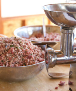 Be sure to have a large supply of freezer paper or other wrapping–restaurant supply stores are the best place to purchase these very inexpensively. Consider purchasing or borrowing a heavy-duty meat grinder with different size grinding plates. This is particularly important if you plan to make a lot of sausage. Have available a large table or two, large food-grade containers, lots of salt (coarse sea salt is best), a scale that can weigh up to 25 pounds, and spices for sausage, ham and bacon cure. Premixing spices for sausage in advance can save time during processing. I measure spices to flavor sausage in 10-pound batches (usually Italian, sage and chorizo). Mixing bacon cure and ham brine in advance will also save time on butchering day. I particularly like the recipes from The River Cottage Meat Book for bacon and hams. There are lots of recipes online, but be sure to select the ones you want to use ahead of time and have all ingredients ready.