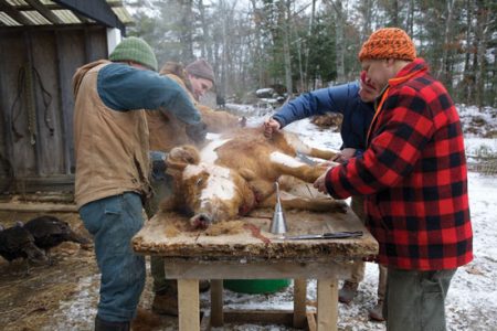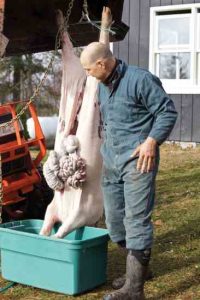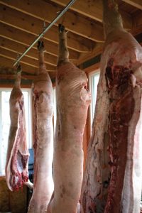 Our processing happens in the winter, once the weather has turned cold. Here in Maine, that means we slaughter in late November or early December. If you don’t have predictable weather, you will need some way to cool the carcasses and keep them cold. You will want to hang the halves, at least overnight, as the meat is easier to handle when cool and after the muscles relax. We hang the halves for five to six days in our unheated back porch. When we had a warmish day during hanging a few years ago, we used a window air conditioner unit with the sensor by a light bulb to cool the space. Make sure the hanging space is safe from rodents and animals, and that it is out of direct sun. Also, be sure you have enough freezer space for all the meat. The amount you pick up from a processing facility and the amount you will have when you slaughter on-site can be radically different.