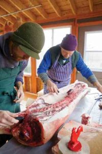 There are other reasons to slaughter on-site. For others we know, not having access to a reputable butcher facility makes on-farm pig processing a necessity. We are lucky to have many wonderful options here in Maine, though getting an appointment can be difficult. If you do live in an area with good butcher shops, getting a time slot that coincides with optimum pig maturity can be difficult. All of the better facilities in our area are typically booked two years in advance. On-site processing means you can process your hogs whenever it works best for you, and for the growth of the pigs you are raising.