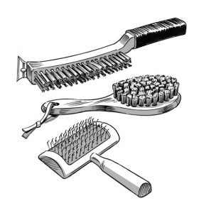 A wire brush with brass or stainless steel bristles will cost more but last longer. Another brush with nylon bristles is handy for brushing hair from the hutch. And a slicker brush, as used on dogs and cats, will take out dead fur and ease a rabbit through a molt.