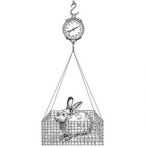 Hanging scale. This is perfect for weighing fryers and other rabbits to make sure they are reaching their growth goals. The hanging type has a hook to hold a bucket or other container and subtracts the weight of the container. I like to weigh my rabbits in one of my wire nest boxes. You can purchase the scales in capacities of either 22 or 55 pounds.