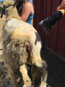 b. Don’t cut the tail. You can leave some wool on the tail, and you don’t need to shear right up against it. This is terrible-quality wool, so you can shear it off a little at a time. What matters is that you remove the dirty wool.