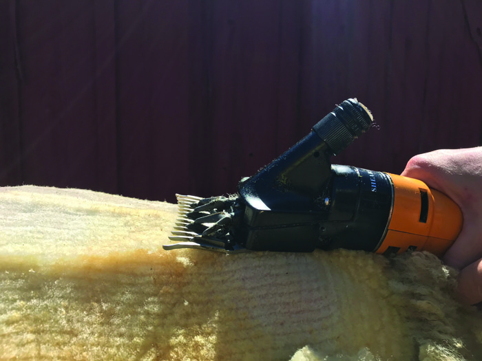 b. Never pull the wool up or toward you; this can pull the skin up into the comb, resulting in a cut. You can pull the skin up to flatten it if it’s wrinkly, and shear over the flat area, but never pull on the wool.