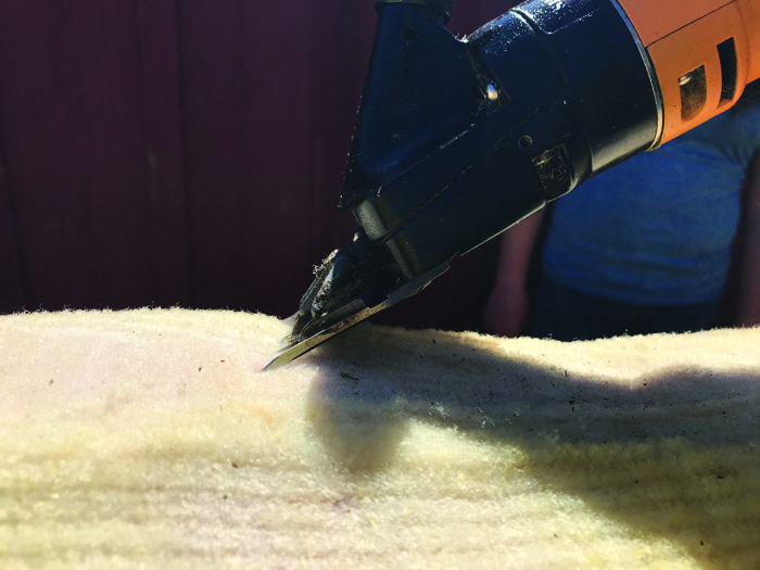 Before shearing, you’ll want the sheep dry, penned, and empty of food and water. Gather the sheep and keep them under cover overnight to ensure they’re dry. Pen them tightly, shoulder to shoulder. Sheep are flock animals and don’t mind this arrangement, and it prevents them from running, so you can reach in and get one more easily. Packing them together also keeps sheep warmer. Wool has lanolin, which is an oil. When sheep are warm, the lanolin liquefies and helps the handpiece glide along smoothly.
