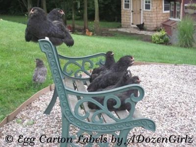 Black Ameraucana chickens (approx. 9 weeks old. One Blue Ameraucana to the left of the bench)