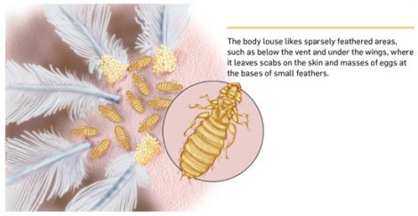 A louse lives for several months, going through its entire life cycle on a bird’s body. It can survive less than a week off the body. The female louse lays her eggs, called nits, on a chicken’s feathers and makes sure they stay there by sticking them down with glue.