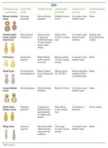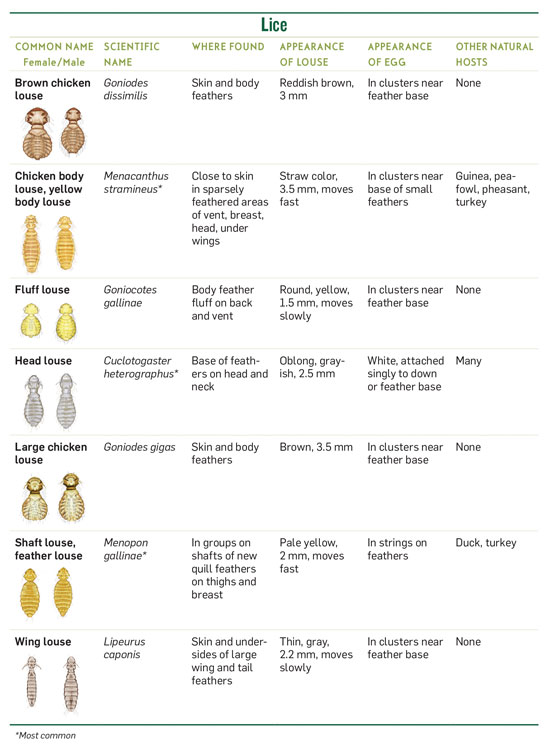 Repeat any treatment twice at 7-day intervals. Avoiding lice largely involves preventing their introduction. Discourage wild birds from nesting in the coop. Treat newly purchased infested chickens before putting them in with an existing flock. When acquiring used feeders, carriers, or other equipment, thoroughly disinfect them to make sure they are not harboring lice.
