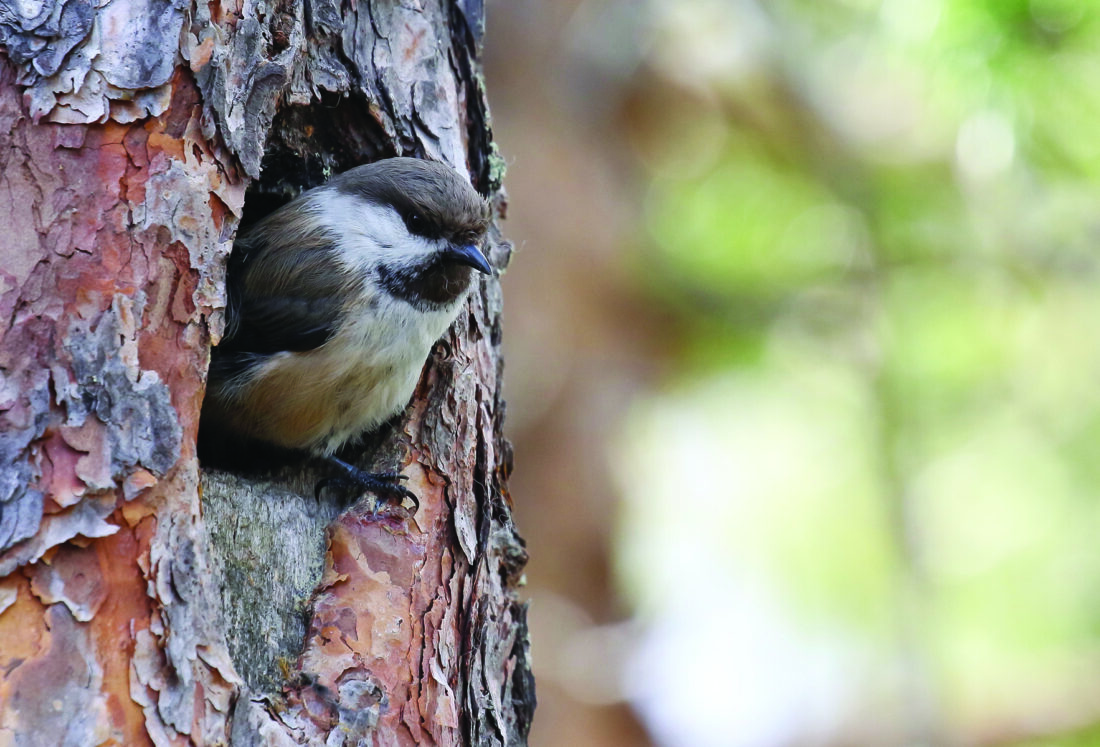 Despite their diminutive size, black-capped chickadees don’t fear humans. In fact, the onomatopoeically named birds seem to introduce themselves by calling their name — “chick-a-dee.” This species’ habit of investigating everything in its home territory makes it one of the first birds most people notice. Once the sentinels spot you, they send out their “chick-a-dee-dee” alarm call to alert other nearby birds that an intruder is in the area. When things settle down a bit, the caller may decide to come in for a closer look. Many times while I walk in the woods, a curious chickadee will follow me, hopping from one tree to another, all the while providing a steady, chattering monologue.