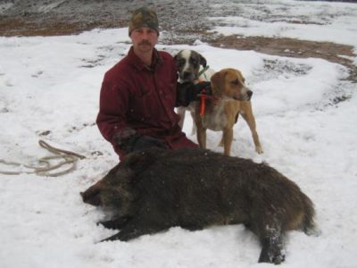 My backwoodsman has lived his life hunting, fishing and trapping. His primary loves have always been deer and turkey hunting. This has changed in recent years with the introduction of feral wild hogs in our region. He now spends a great deal of his time working with dogs he has trained for baying and catching hogs. It is a unique sport, as knives are preferred over guns for harvesting, primarily to keep the dogs safe while catching the hog. He is in the woods all year with the addition of his hunting sport to his interests, and we are lucky to have ample stock in the freezer as a result.