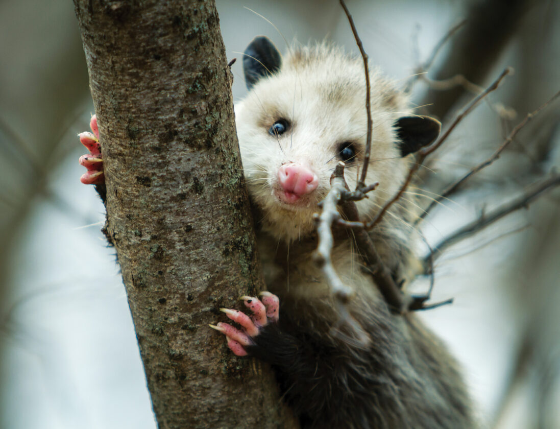 My first up-close encounter with an opossum took place years ago, when I went to get feed for our horses one evening. I was used to seeing these hairy, grayish animals flattened on the road, their lives abruptly and unceremoniously ended while out on a nightly prowl, but I was not expecting to see an 18-inch-long freeloader wedged under the feed bin. I walked over for a closer look, which prompted a couple of low hisses, but it didn’t move. The poor animal was probably as surprised to see me as I was to see it. I’d unknowingly put out the opossum welcome mat when I forgot to close the feed room door that morning.