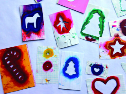 Negative stencils. The piece cut out of a stencil can be used as a negative (or reverse) stencil, producing, for example, a sheet of white Christmas trees, each surrounded with green. This works well with snowflake cutouts on white paper too, maybe with light-blue paint – but it could also give a little spookiness to images of trolls or elves, as if they aren’t really there.