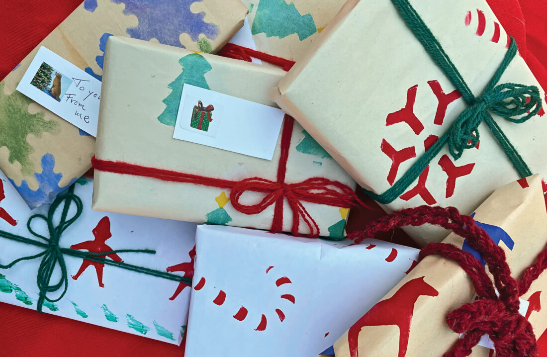 I did a gift-wrap session with my church’s Sunday school twice. The first time, we used stencils and stamps, and the children didn’t quite get it and put a couple of random motifs in odd places, coming nowhere near to covering the paper. The second time, the Sunday-school teacher carefully ruled brown wrapping paper into 2-by-5-inch rectangles and told the kids to put whatever stamps they wanted in each rectangle (see photo, below).