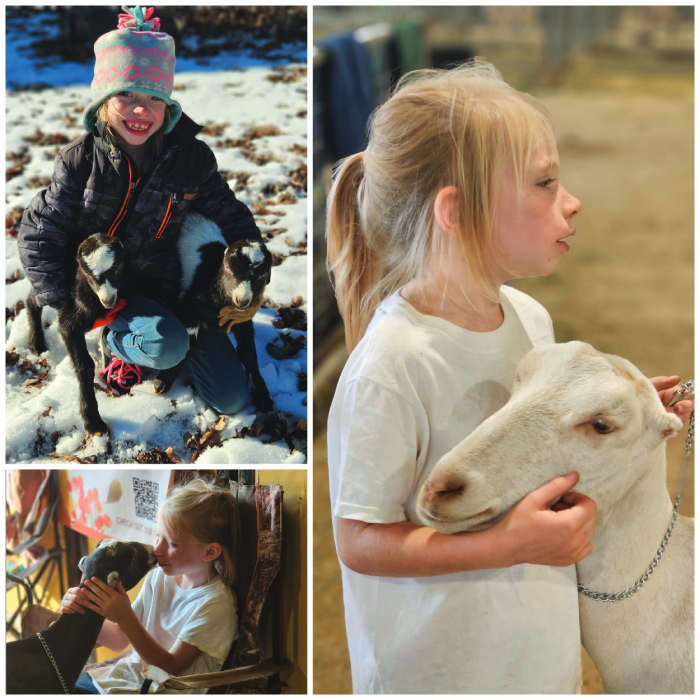 Braelie picked out a LaMancha doe, whom she named Peaches Snowcone, because the doe is white and has a little orange streak on the back of her neck. Peaches was incredibly wild when they brought her home, but in a matter of a few weeks, Braelie turned her into one of the most domesticated goats you’ll ever see.