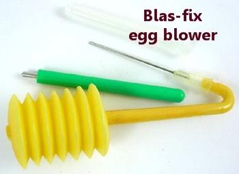 If using the Blas-fix®, the uncovered needle is inserted into the hole and air pumped in with the bellows. The egg ideally streams out the very hole the needle occupies, but it doesn’t always work as one might hope. In my experience, the bellows wear out very quickly, eventually cracking, resulting in a lack of sufficient pressure to get the egg out of the shell. They work great at first but don’t last long enough. Calling on lung power or an aspirator is inevitable.