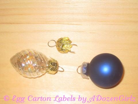 To hang my blown eggs, I use either bead caps with ribbon , elastic string or, my preferred method: ornament caps. I buy miniature ornaments and pirate them for use on my decorated eggs. No glue is required to hold them in place as the pressure from the little wires is adequate to keep them from coming out of the egg.