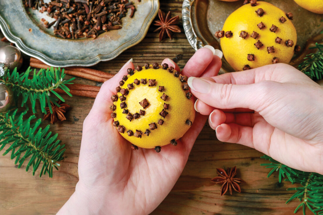 There are many ways to decorate a home with food. Arrange cookies or other treats in decorated bowls, or build a snowman from little sandwiches. Clean and scent pinecones, and add them to netting for a unique decoration or parting gift for your visitors. Preserve an apple with cloves as an aromatic decoration and takeaway gift.