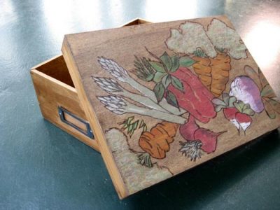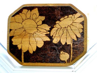 My next project was a vegetable design on a seed box and with this and the previous vase I learned to work with colors. I outlined the design and woodburned, then used oil pastels which are similar to crayons and blended several colors trying to create shades. Then I realized as I read more about woodburning that a lot of a design is created with tones and shades using the tool itself. I gave it a try and created this sunflower plaque and as you can see the background was darkened by burning the wood with the tool.