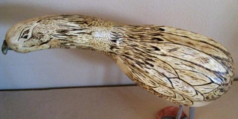 Common surfaces used to burn designs or patterns onto are wood, gourds and leather. My interest became peaked when I decided to grow gourds in my garden and now I am not only fascinated with gourds but woodburning as well. Although the growing season had passed and I was unable to grow my own gourds, I was able to purchase some at the local fall festivals. They do require a drying out time and I created a work of art as a Christmas gift for my Mom.