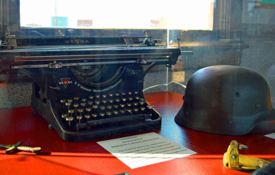 Another famous artifact displayed here, is a manual German-Groma 1930s typewriter that was ceased by the Allies at Adolf Hitler’s mountain hideaway, the “Eagle’s Nest,” near Saltzburg, Austria at the end of World War II. It was donated by the local family of a soldier assigned to inventory the items found in Adolf Hitler’s compound.
