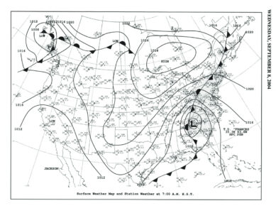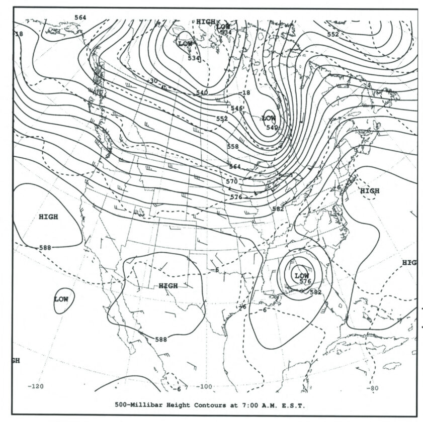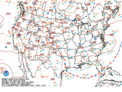 The basis of the surface map is the pressure field, the atmospheric pressure measured by a barometer at these weather stations. The lines you see all over the map are called “isobars,” lines of equal pressure. The numbers on the lines represent pressure values expressed in millibars, a standard unit of pressure measurement.