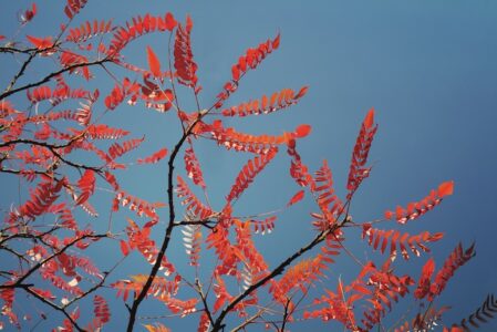 If you have ever spent a fall in the central portion of the United States, you have likely seen one of the most amazing fall coloring plants: staghorn sumac. This plant grows 8 to 10 feet tall, in colonies that can spread widely along timberlines and unkept grasslands. In fall, its leaves become deep orange to crimson red. Some staghorn sumac selections are suitable for use in the landscape, but unfortunately, because of its size and tendency to spread, the plants are difficult to use in the average landscape.