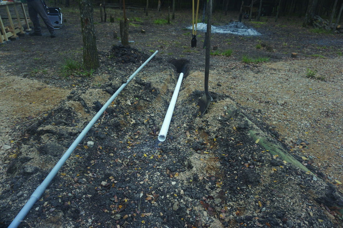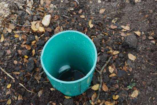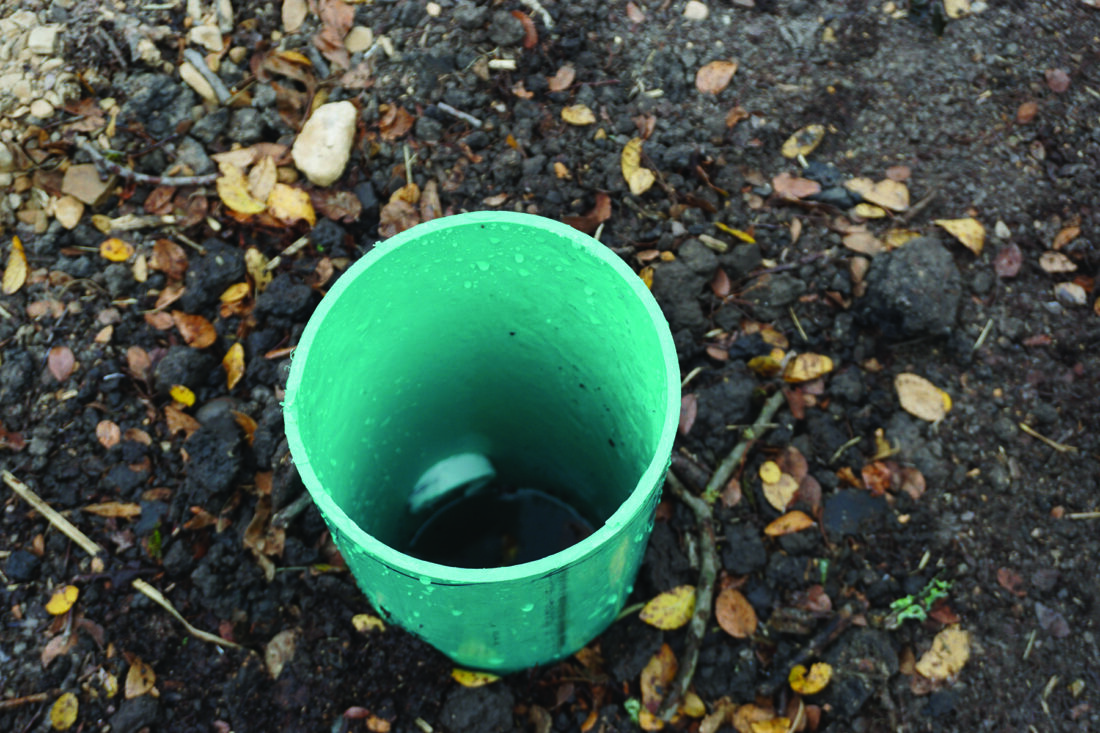 Step 1: After purchasing the necessary supplies and choosing the drill location, begin digging the main drill hole with an auger or post-hole digger. Dig about 4 or 5 feet. Then, if necessary, cut the 8-inch PVC to fit the hole, allowing 4 inches to stick above ground. In the side of the PVC pipe aligned with the settling pond (see Step 2), drill a hole large enough to insert the 2-inch connecting PVC pipe.