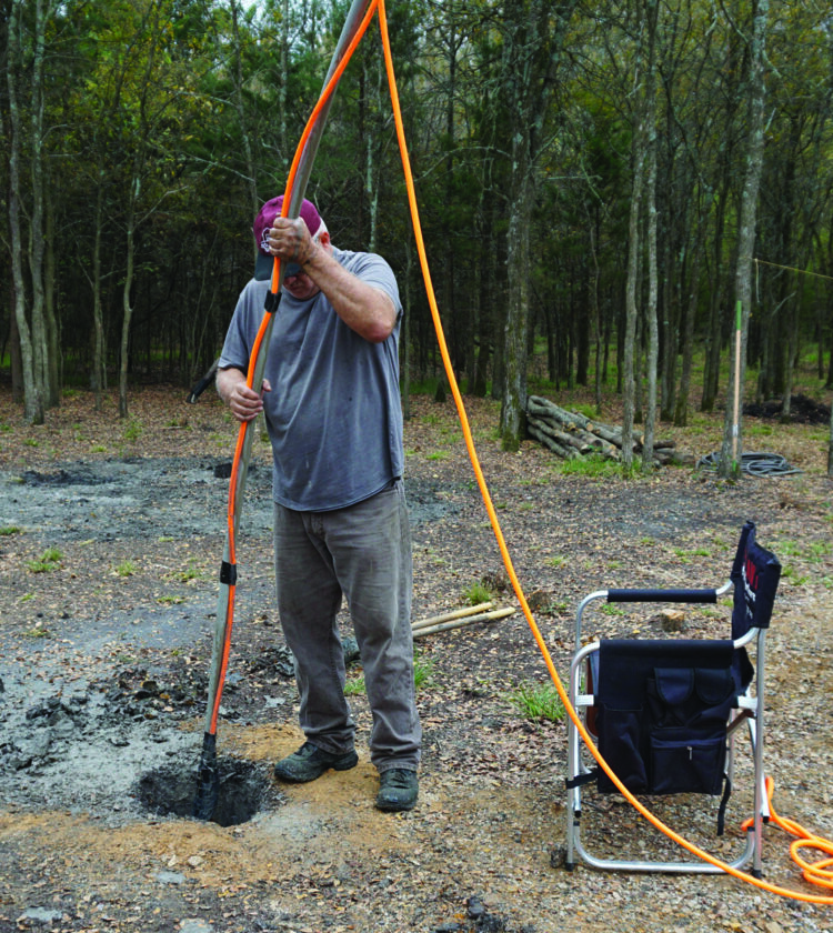 Drilling a well with this tool can take anywhere from 15 hours to weeks depending on the soil type, so make sure a chair is handy and you’re working with at least three people. One to operate the compressor, another to drill, and a third for breaks.