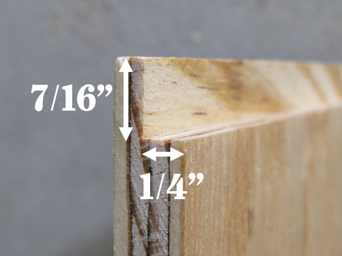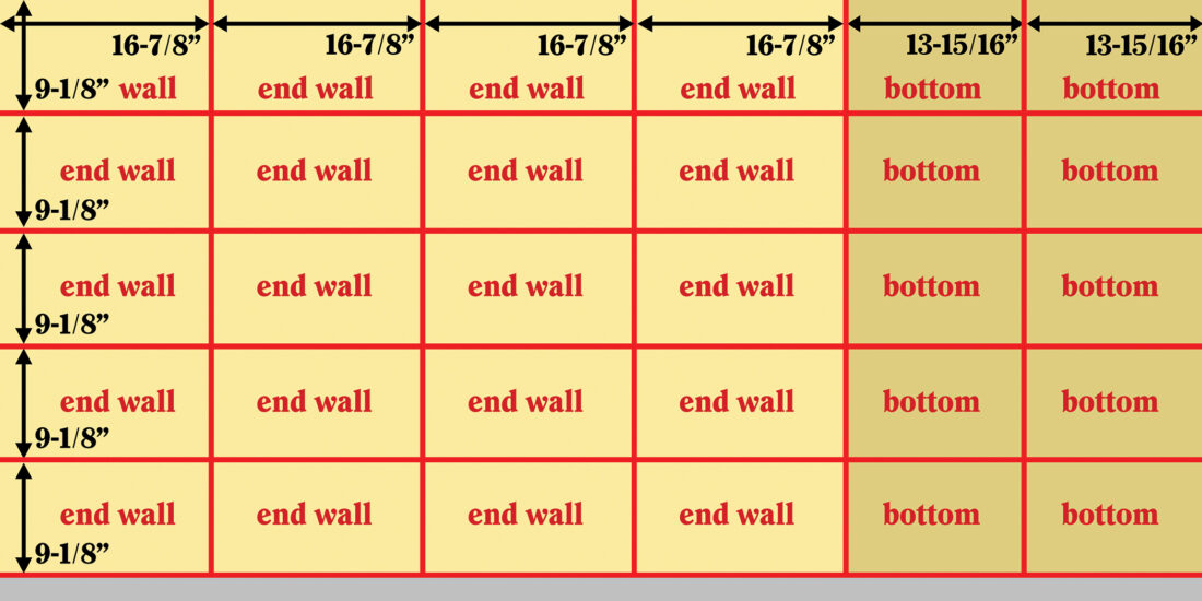 - Cut the 15/32-inch plywood as shown on the cut diagram on page 35. You’ll end up with 20 pieces 16-7/8-by-1/8-inch end walls, and 10 pieces of 13-15/16-by-9-1/8-inch bottoms.