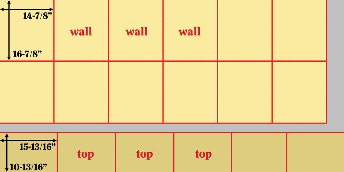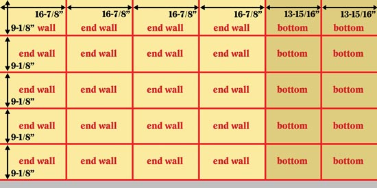 - Cut the 3/8-inch plywood as shown on page 35 the second cut diagram. This will give you 12 front/back walls measuring 14-7/8-by-16-7/8-inch, and six tops measuring 15-13/16-by-10-13/16-inch.