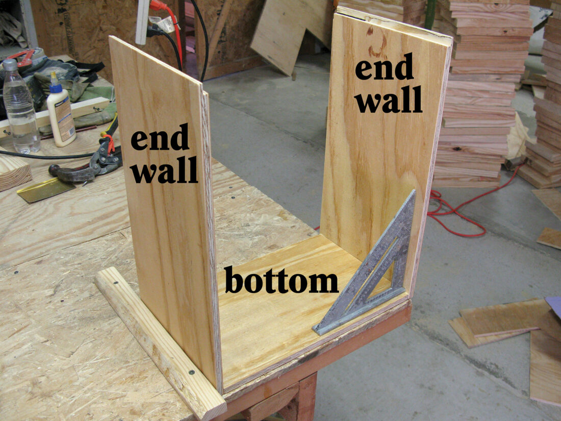 - Assemble the box. Put the bottom on a flat surface. Using glue and staples, attach one end wall so its frame rest faces in. Attach the opposite wall the same. Attach the front wall, then the back wall, and the box is done.