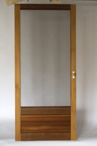 I made this DIY screen door out of western red cedar, a lightweight yet rot- and weather-resistant softwood. It is sold in my area as dimensional building lumber in housing construction-oriented lumberyards, and not in hardwood lumberyards.