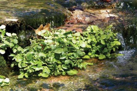 - Watercress — Having peppery, small leaves with tender, edible stems, watercress grows in running creeks. Cut the top 2 to 3 inches of the plant with scissors. Do not pull, or you will get a handful of roots. The tiny, white, hairlike roots growing on the sides of the watercress stems are edible; they do not have to be removed before eating. One cup of raw watercress contains a mere 4 calories.