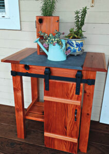 I liked making this table out of hardwood for inside the house. But an outdoor table made out of spare redwood (which is usually on hand after a deck or fence project) with a bluestone paver would be a superb addition to any deck or porch. Perhaps it could even be made of leftover redwood from the very deck on which it sits. I’ve also added a sweet little barn door to my table.