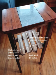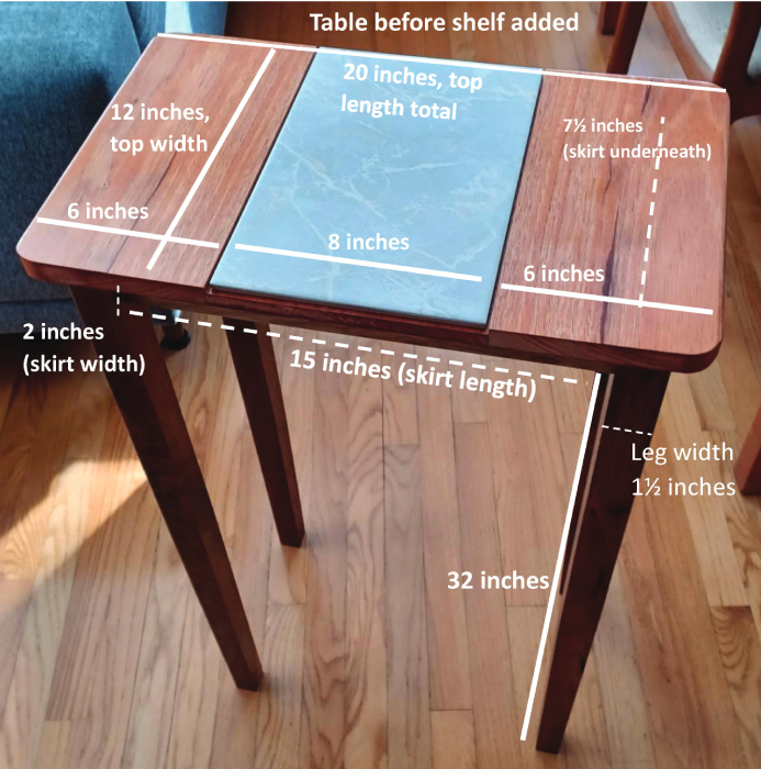 Having added to the never-ending punch list of woodshop tasks, I look around to see what hardwoods I have on hand for legs (long ones), a top, a table skirt, and a little shelf to give it a bit of personality. I also get the idea to incorporate an 8-by-12-inch rectangular piece of porcelain tile on the top of the table as the centerpiece.
