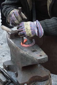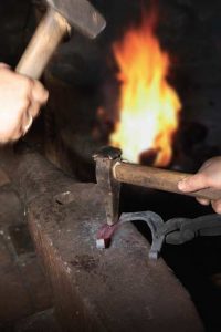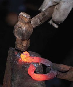Lay the end of the steel on the round end of the anvil again. Curve the straight end of the steel around to be the same roundness of the horse’s hoof. If you have an already-made shoe it can be your pattern.