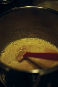 - With a rubber spatula, stir the mixture of soap, wax, and oil well, taking care to mix in any buildup on the sides of the pot. Turn off the heat, and stir occasionally as it begins to thicken.