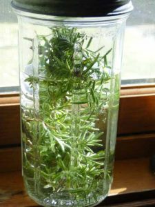 I placed the jar in a sunny window for 2 to 3 weeks … because the fragrance was strong enough, I strained the herbs from the vinegar using a colander. If it wasn’t quite fragrant enough, I could have let it sit in the sun for another week. Once the herbs have been strained out, the vinegar was poured into a spray bottle and use it as I would any modern disinfectant.