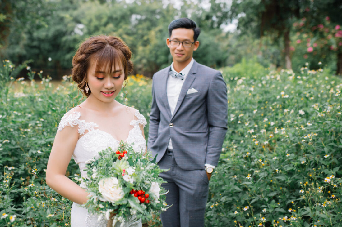 When your plants begin to flower, you’ll need to regularly chop off dead flower heads to ensure they keep producing. Once you’re ready to harvest for your wedding, bring clean buckets and a sharp pair of scissors. Cut the stems at a 45-degree angle and remove stray leaves before placing in the bucket.
