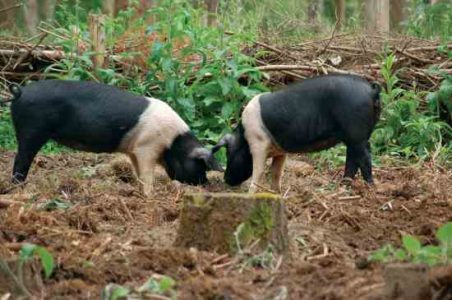 If your woodlot is loaded with briars, vines and overgrown understory, pasturing pigs will help clear the mess out so grasses or more beneficial trees and plants can be propagated. We pasture about four pigs per acre of woods, but with more grain and the right soil conditions, you can seasonally keep up to 25 pigs per acre, depending on breed size and other variables. Or if you have a sufficient area of mixed eastern hardwoods, you can let one pig roam three to four acres all summer and feed very little grain. Folks lucky enough to have an orchard (or one nearby) might consider allowing the pigs to keep the orchard grounds free of windfalls.