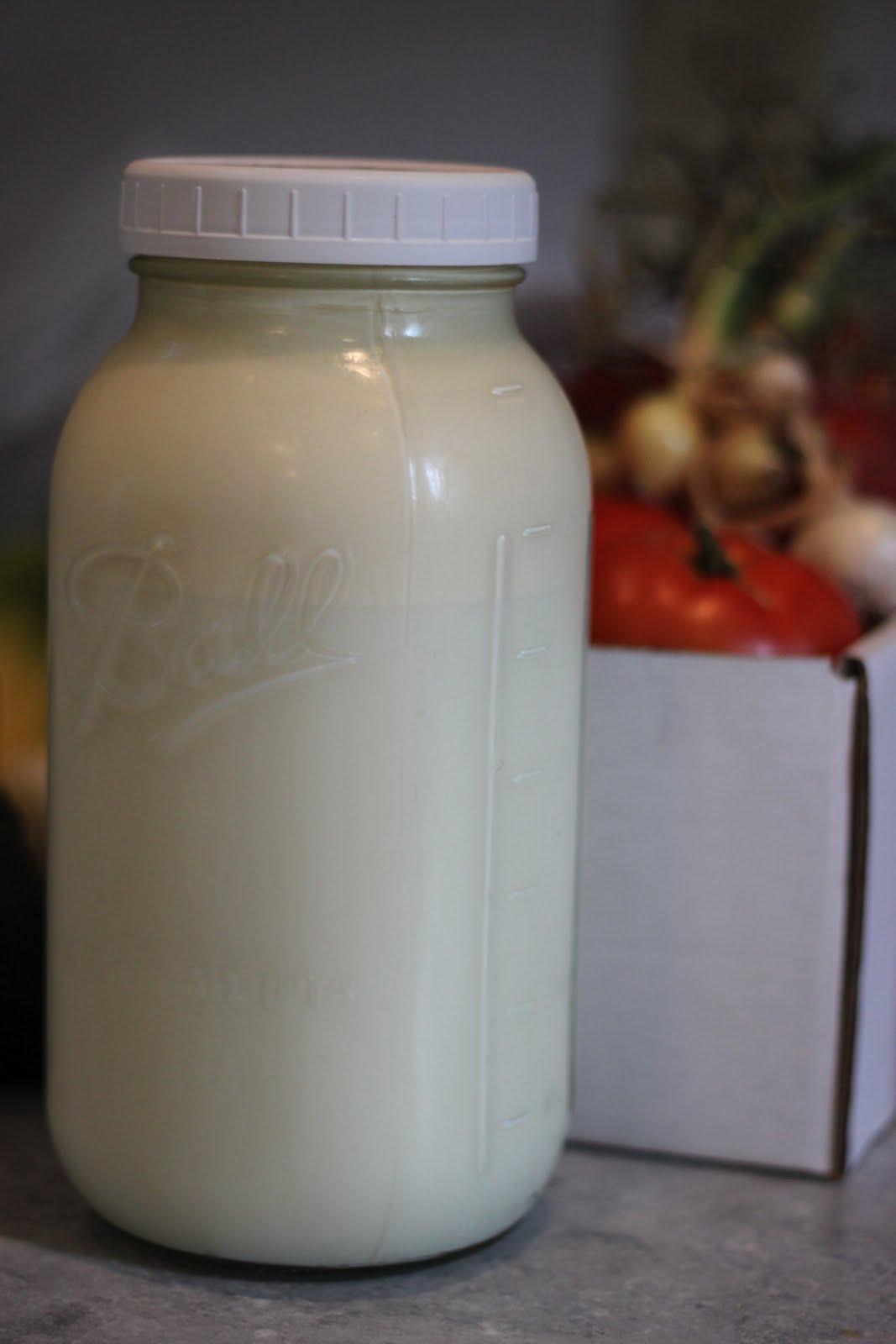 You can see the cream line on top and we’ve discovered over the years that skimming the cream off is best as it does weird stuff when it sours. Use the cream fresh for whipping cream, in your coffee, alfredo sauce, etc.