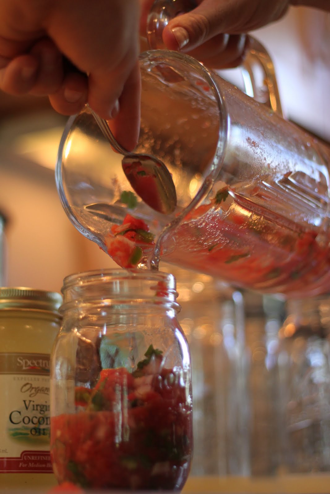 Once you have divied out the whey and salt, now is the time to add your salsa. We were missing our trusty canning funnel, so we had to carefully scoop the mixture into each jar, but no matter.