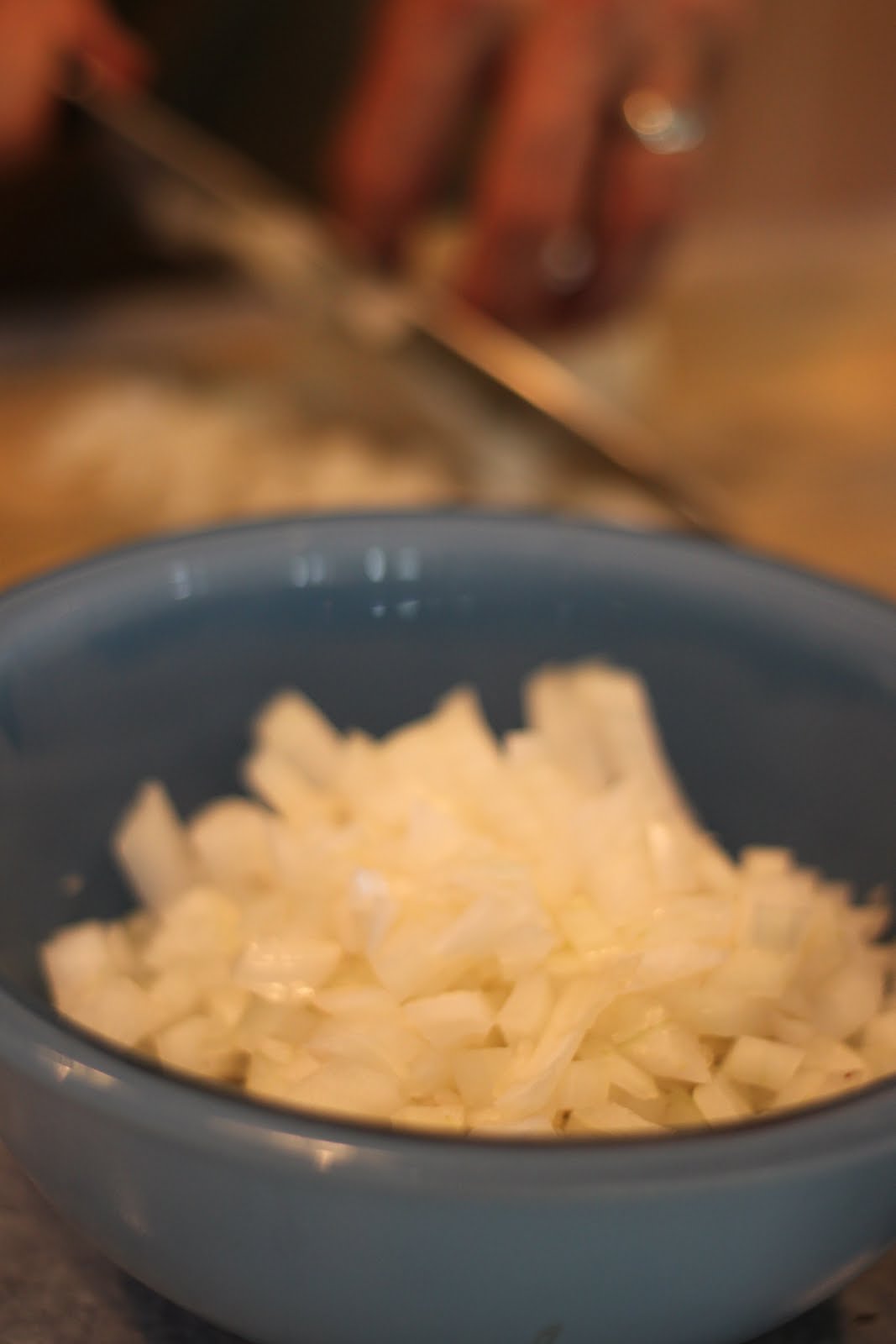 First dice your onions. Or do them last. Whatever. I’m just showing you the order of our salsa. It all goes in the same bowl.