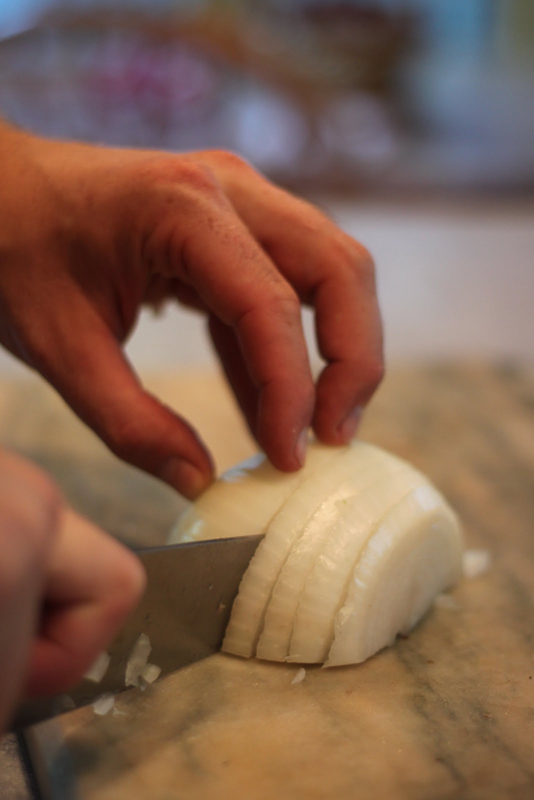 Andy has a cheater trick for chopping onions. Below you see him slicing lines into a halved onion about a half inch thick. The onion is halved for greater stability. You will do the same thing for the other half soon. The lines he cuts are not through to the other side. Rather, they reach to about a half inch from the other edge of the onion. This keeps the onion together.