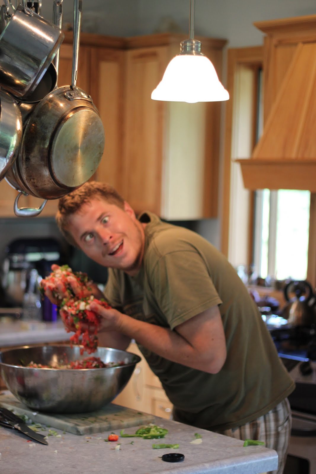 Andy, in his eternal quest to find the most efficient method in every process, wondered if dicing all these skinless, seedless, slippery globs of tomatoes was the best route. He experimented with a food processor on short bursts of speeds and found the result to be satisfactory. The tomatoes were chopped and runny, but exactly the desired consistency for salsa. This little trick saved us quite a bit of time.