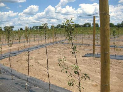 They received a computer printout with GPS coordinates for each tree and began planting. Trickle irrigation lines and landscape fabric for weed control were also put in place.