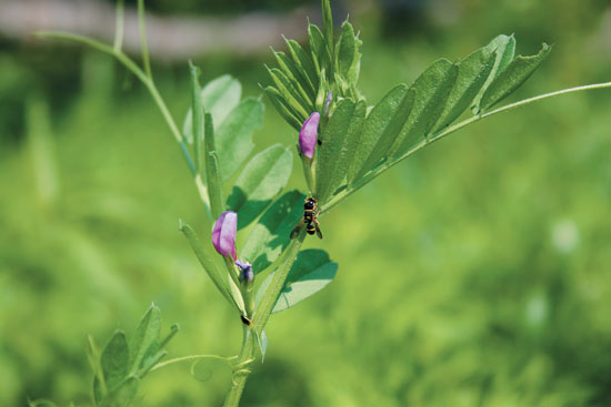 In addition, if you are looking for a break from weeding, the presence of weeds can provide natural enemies with shelter, alternative prey, and in some cases, pollen and nectar resources. Other plants can also be established within gardens as living mulch. Plants such as hairy vetch (Vicia villosa), rye grass (Lolium), or alfalfa (Medicago sativa) can be seeded into a garden space in the fall. In the spring, strips can be tilled into this mulch, and crops may be established into the strips. The strips of mulch remaining between garden rows provide shelter and alternative prey for natural enemies.